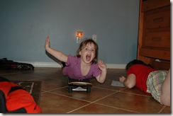 After arriving at the cousins’ house, Brianna saw the kids and started playing with them…Everybody went outside and she came out and was having fun with Shyler…They found a little green truck to ride down the hill on and then found a 2-wheel dolley…Brianna stood on the dolley and Shyler pushed her around the yard…They were having lots of fun…
